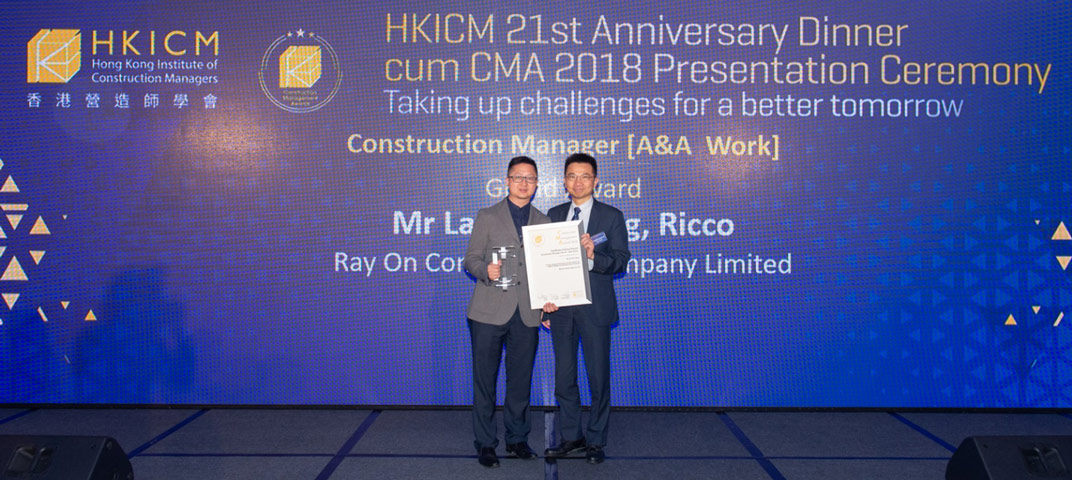Ray On Construction completed the iconic Ocean Terminal Extension project in 2017. We are pleased that our efforts have received recognitions from the Hong Kong Institute of Construction Mangers. In November 2018, Ray On Construction was awarded the Excellent Construction Team Grand Award (A&A Works) for the delivery of the Ocean Terminal Extension. The Hong Kong Institute of Construction Mangers also awarded four members from Ray On Construction for their individual contributions in the project.